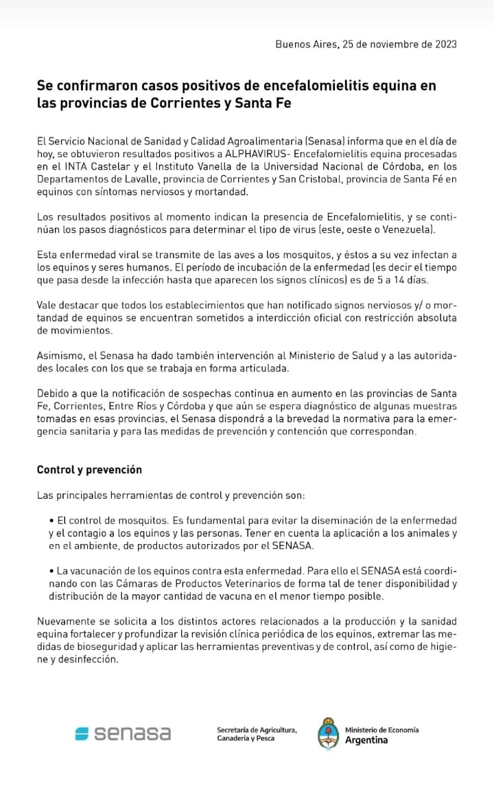 Se confirman casos de encefalomielitis equina en las provincias de Corrientes y Santa Fe Se confirman casos de encefalomielitis equina en las provincias de Corrientes y Santa Fe